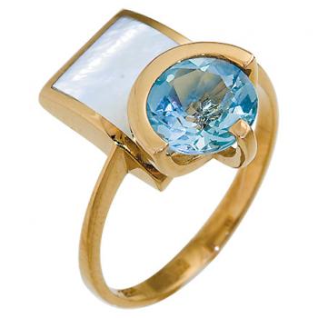 Кольцо из золота 750 пробы с голубым топазом и вставкой из перламутра. Перламутр (от нем.Perlmutter — «мать жемчуга») который используется в украшениях ""Арт Фацет" - натурального происхождения, это внутренний слой раковин морских моллюсков.